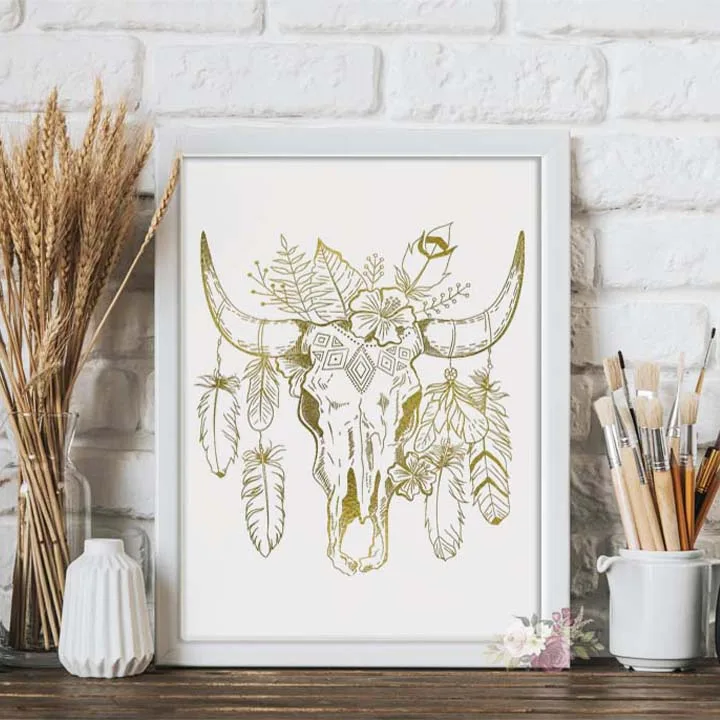 Boho Skull Feather Floral 8.5×11 Foil Print