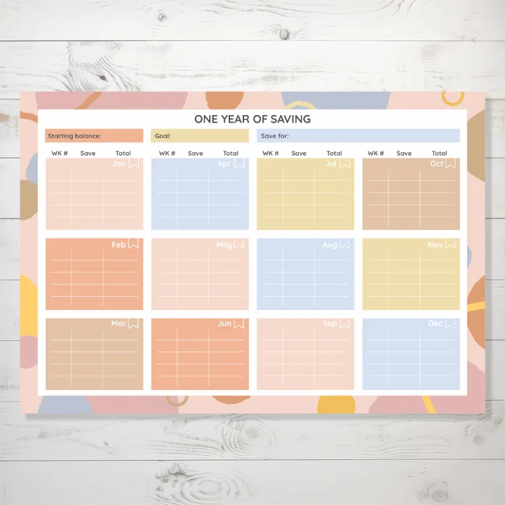 Our aesthetic savings goal tracker sticker sheet measures approximately 4.5″x6.5″ and contains one large sticker on our writeable matte sticker paper.